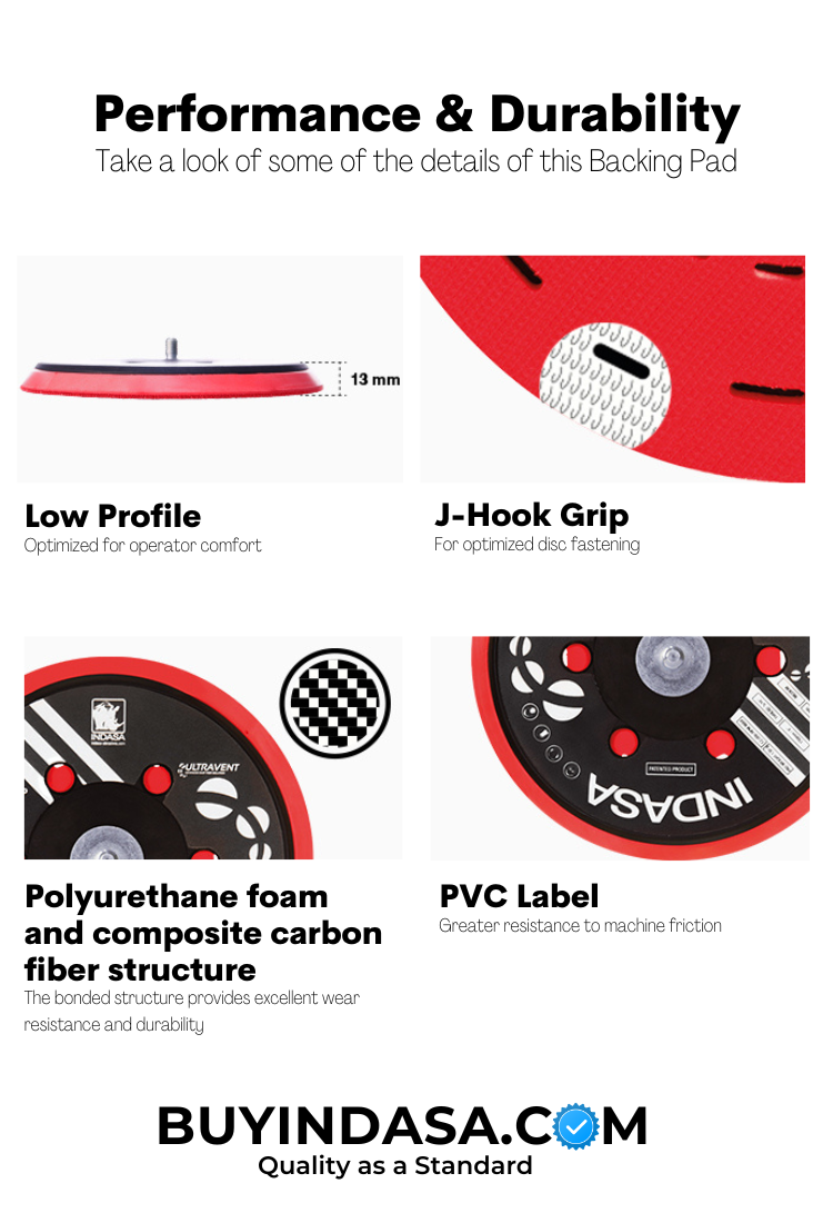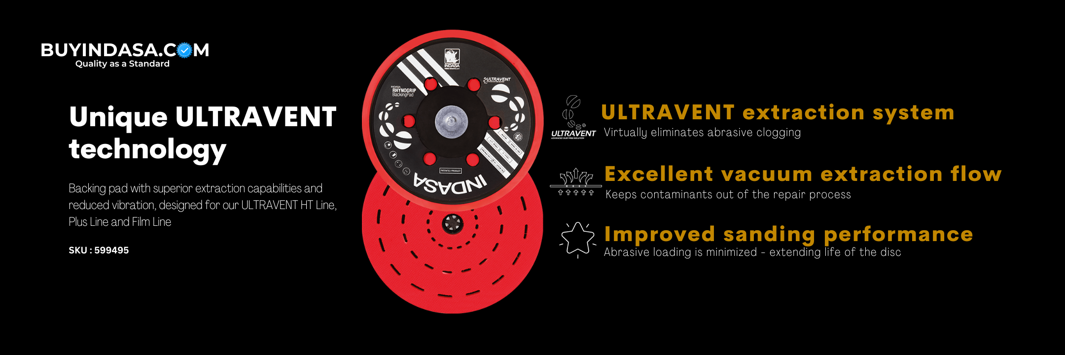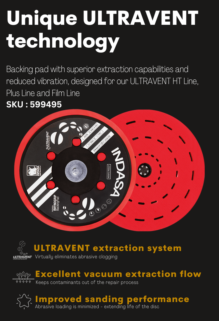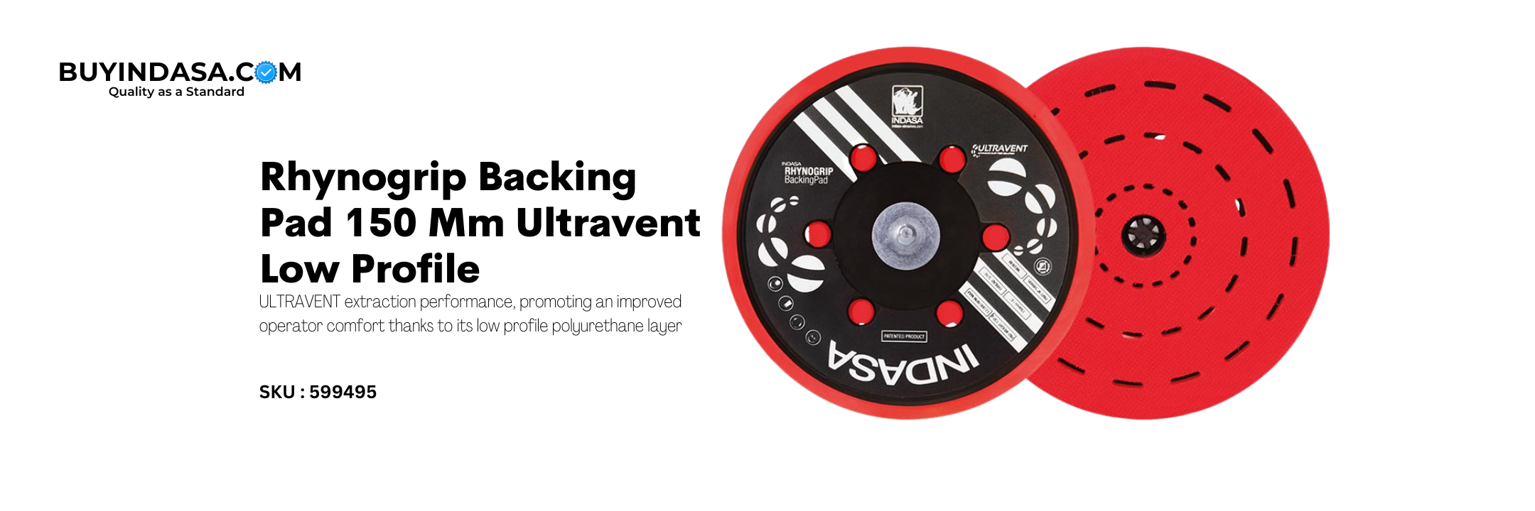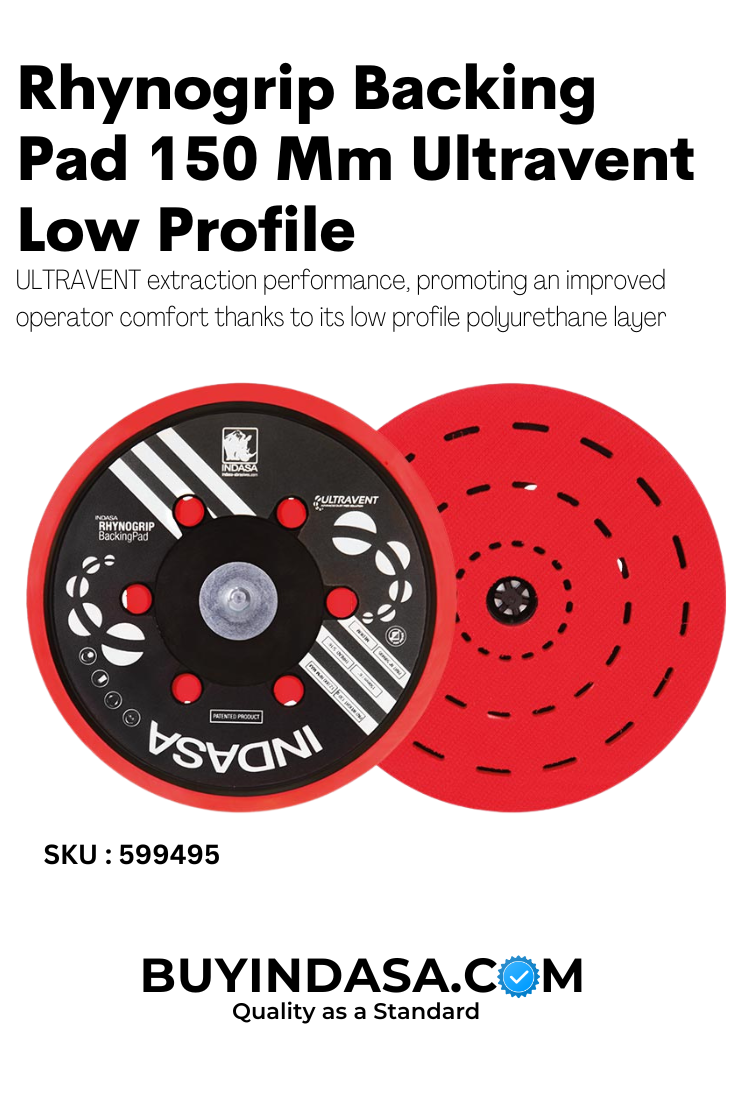 Indasa Rhynogrip 6" Ultravent Multi-Hole Grip Low Profile Backup Pad (599495) ULTRAVENT extraction performance, promoting an improved operator comfort thanks to its low profile polyurethane layer. Unique ULTRAVENT technology. Backing pad with superior extraction capabilities and reduced vibration, designed for our ULTRAVENT HT Line, Plus Line and Film Line
